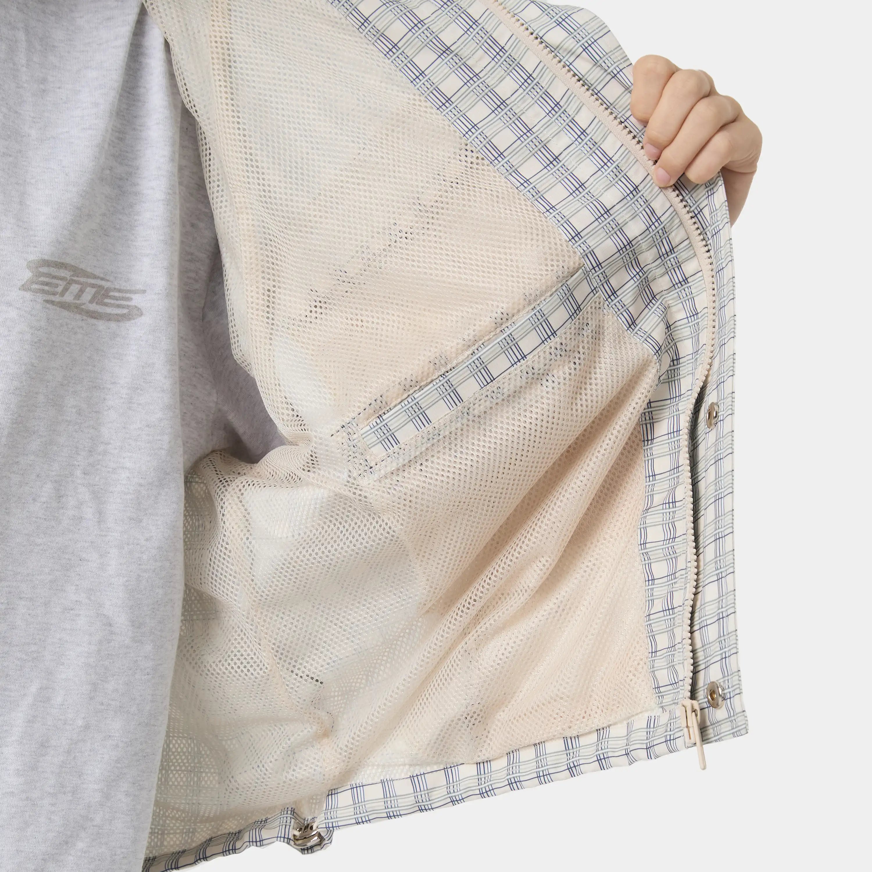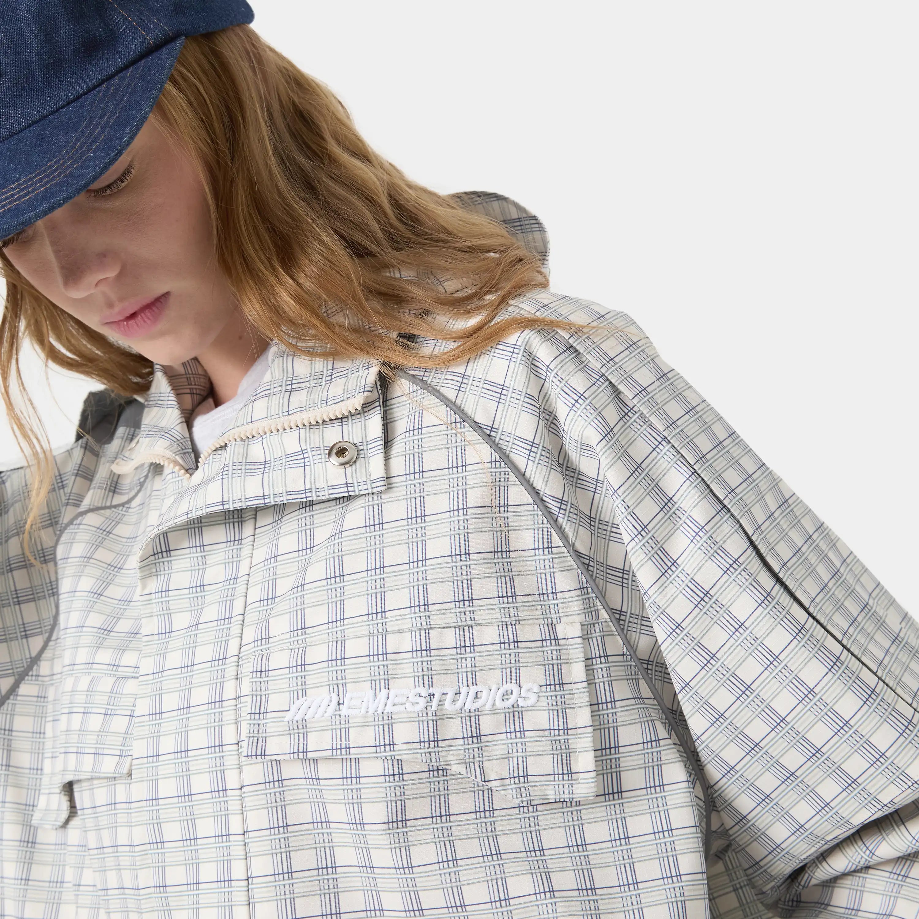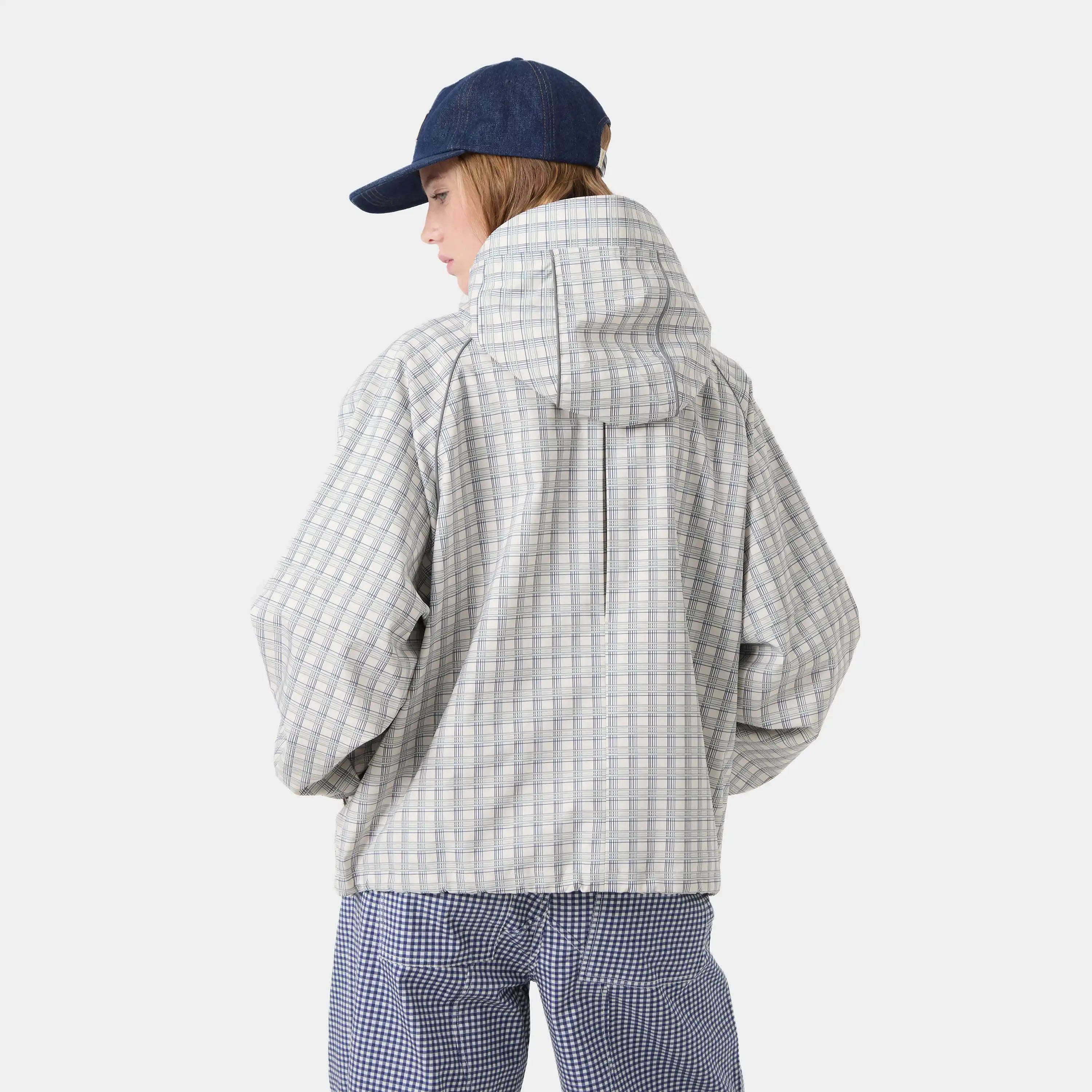 Reflective details, custom tartan fabric, visor hood, kiss pleat back, breathable mesh lining, adjustable hem